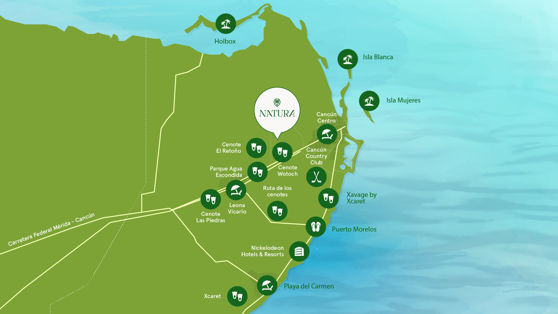 Natura está ubicada a 20 minutos de Cancún, con cercanía a toda la Riviera Maya, en donde encontraras diversas actividades recreativas.
